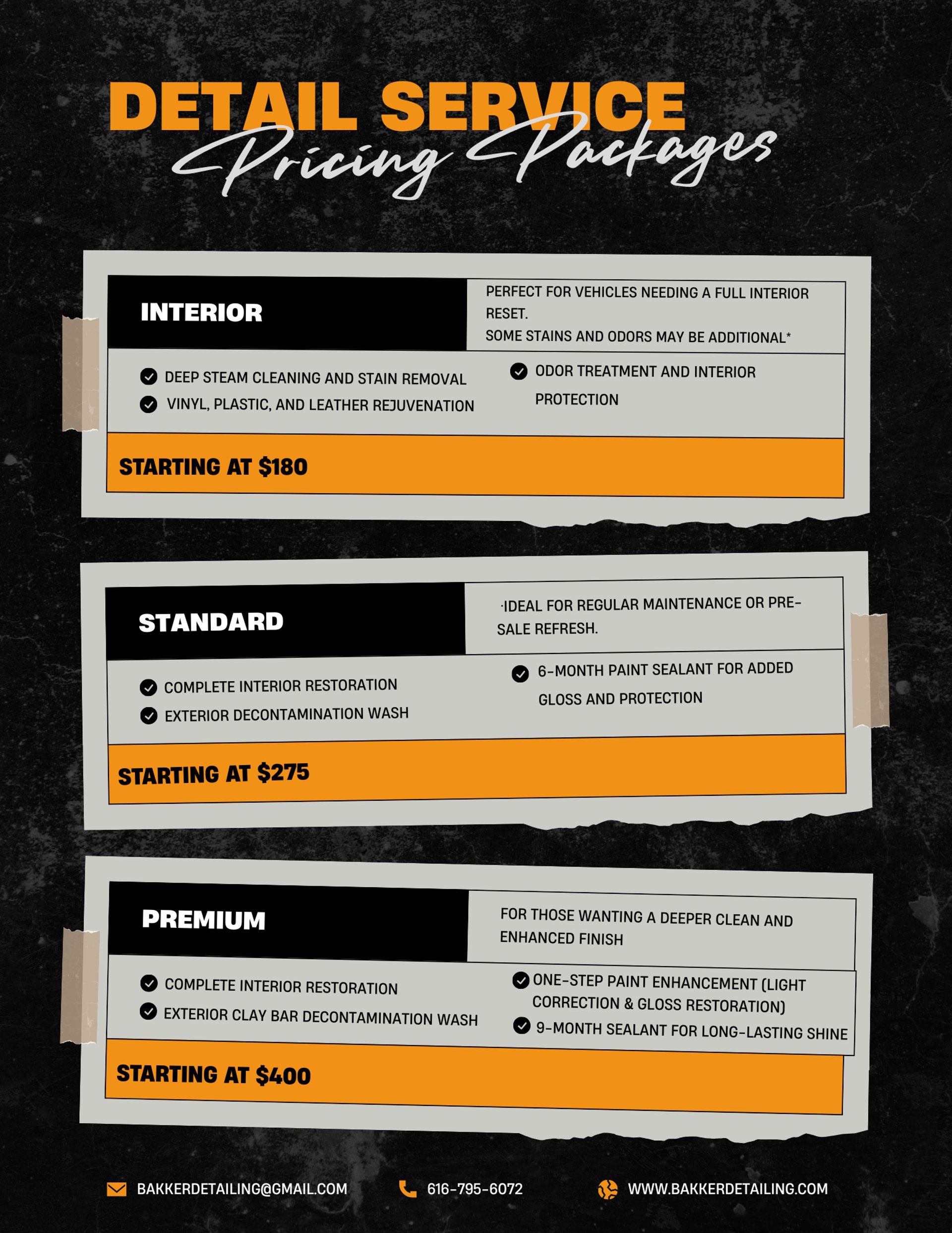 Bakker Detailing was built on a passion for excellence, service, and faith. What started as cleaning vehicles with whatever tools were available grew into a commitment to doing every job the right way - Treating each vehicle with care and every customer with respect. Based in Zeeland Michigan, we proudly serve our local community with high-quality auto and Marine detailing, always striving to honor God through honest work, attention to detail, and a servant-first mindset. Our goal is simple: deliver results we're proud of and service that reflects our faith and values.